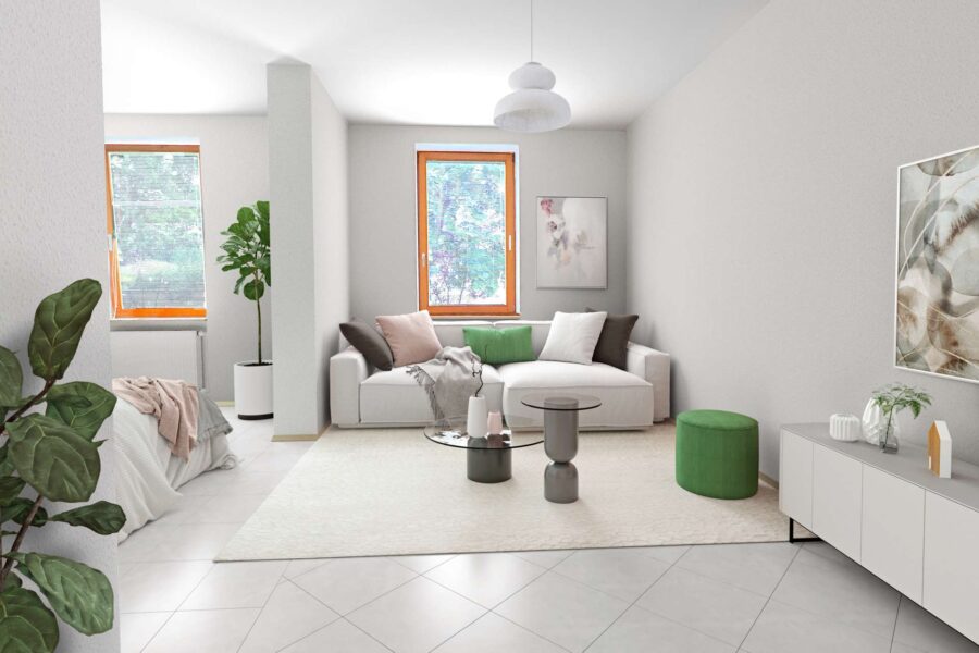 Der großzügige Wohn- und Essbereich ist das Herzstück der Wohnung und besticht durch seine offene, einladende Atmosphäre. Große Fenster lassen viel Tageslicht herein und schaffen eine freundliche Wohnqualität. Der ca. 5 m² große Balkon in Süd-Ost-Ausrichtung ist ein weiteres Highlight – hier können Sie entspannt den Feierabend genießen oder den Tag mit einer Tasse Kaffee beginnen.